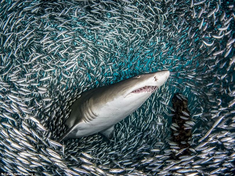 然而沙虎鲨淡定地穿过这些小鱼,颇有“万鱼丛中过 片鳞不沾身”的风骨。