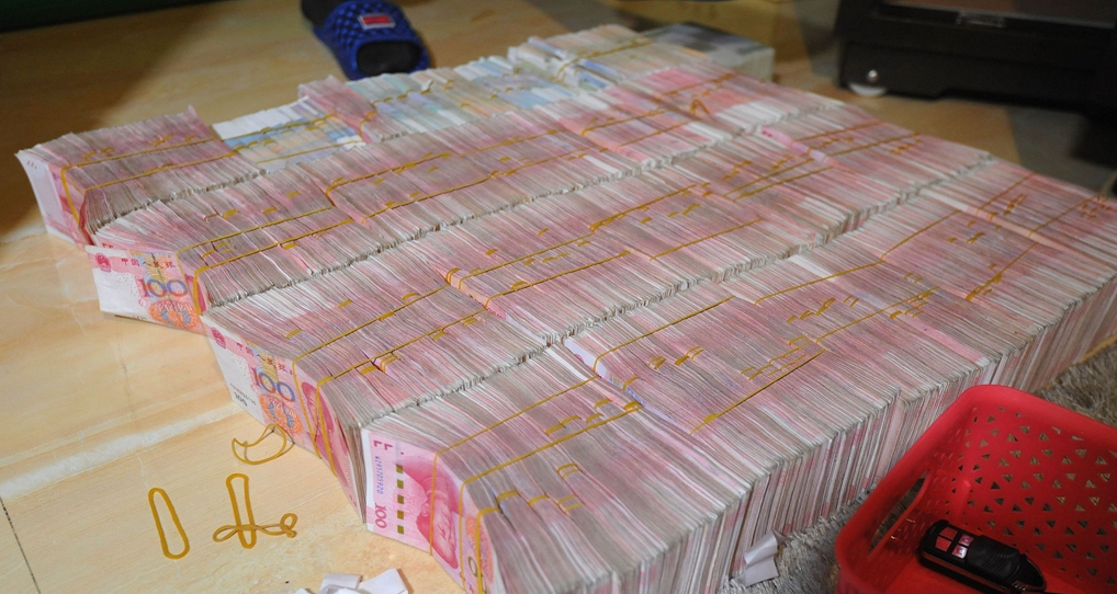 2017年初,该案被广西公安厅立为特大传销案件进行督办。经侦查研判,专案组基本查明了该传销组织的运作模式、组织架构、人员组成等情况,并锁定了传销体系顶层的重要组织领导者和骨干人员。图为当场缴获的成捆现金。