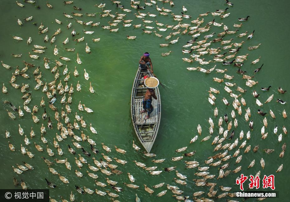 8月23日消息,在孟加拉国Dhunat Upazila,100多只家养的鸭子在当地Karatoa河上围绕着农夫的小船,等待农夫喂食。 图片来源:视觉中国