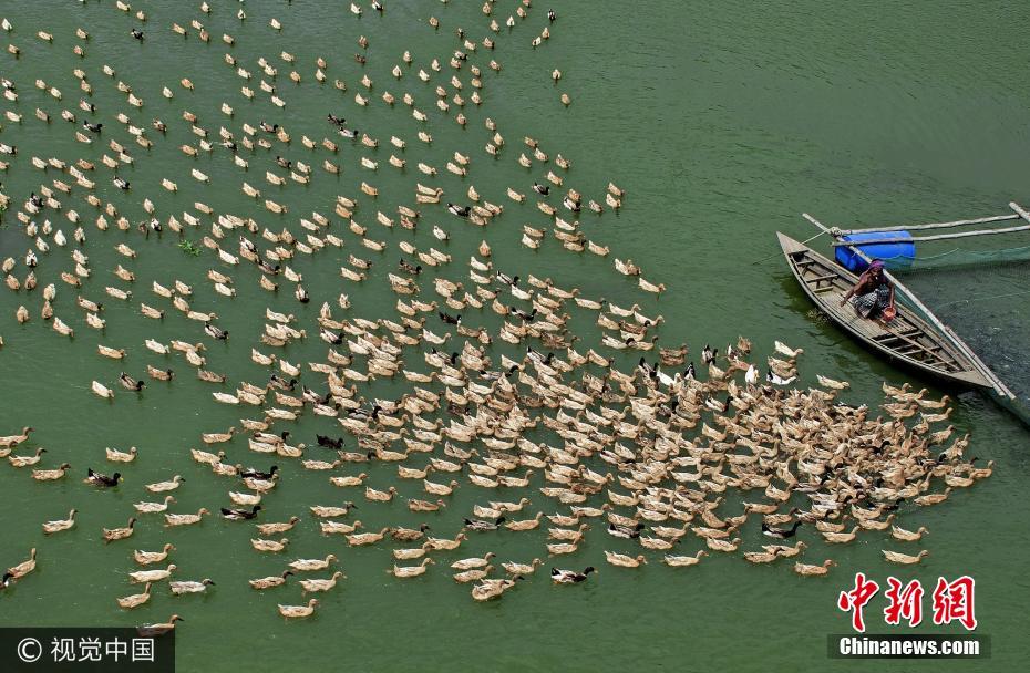 8月23日消息,在孟加拉国Dhunat Upazila,100多只家养的鸭子在当地Karatoa河上围绕着农夫的小船,等待农夫喂食。 图片来源:视觉中国
