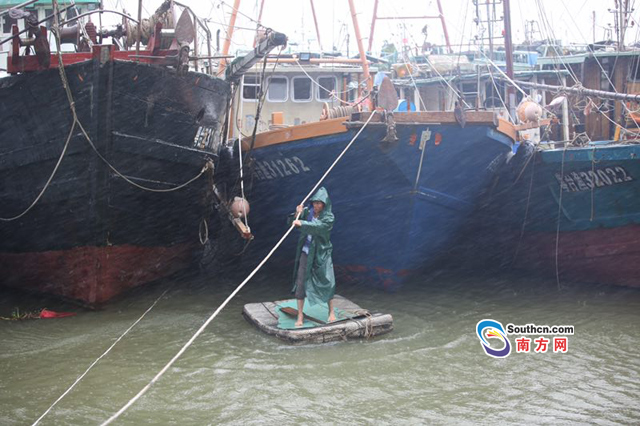 “天鸽”已给广东带来明显风雨影响。图为台山市横山渔港,台风即将登陆时,渔民们加固渔船。