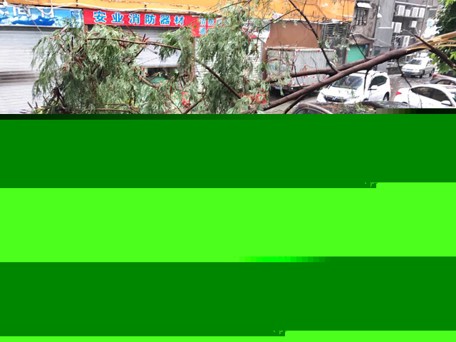 “天鸽”已给广东带来明显风雨影响。图为在龙岗区公园路6号,被风吹倒的树压到私家车上,车主正在清理树枝。