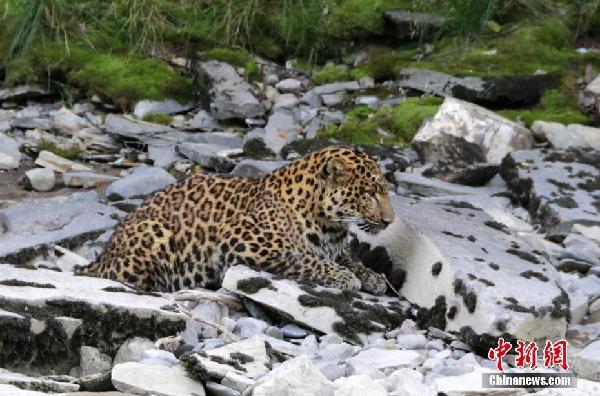 8月29日,四川甘孜州炉霍县泥巴乡境内发现一只野生花豹,该只花豹体长超过1米,其在河边滞留约5个小时后返回森林。中新社发杨孝康 摄