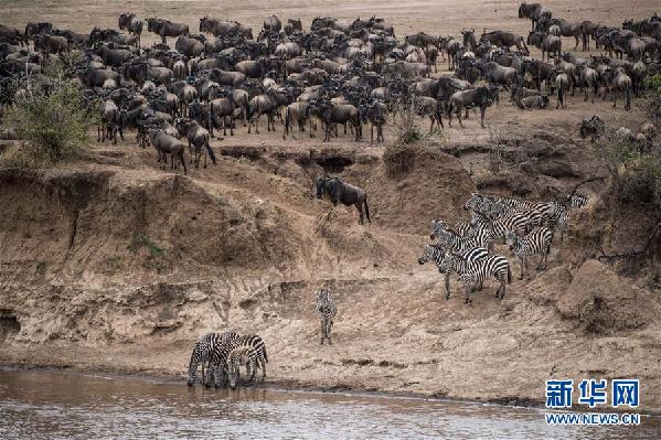 8月28日,在肯尼亚马赛马拉国家保护区,角马和斑马在马拉河边休整,准备过河。肯尼亚马赛马拉国家保护区是世界上著名的野生动物保护区,面积达1000多平方公里,保护区内栖息的野生动物超过600种。新华社记者陈诚摄