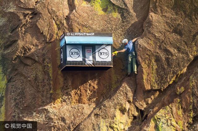 据报道,这间“崖壁店”位于离地1828米的陡峭石壁上。店铺座落的地点是要带上安全装备,四肢并用才能攀抵。