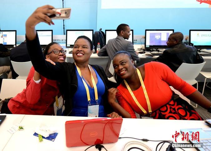 9月3日,来自非洲的3位女记者在厦门新闻中心自拍合影留念。据悉,共有80个国家和地区的3000名中外记者报名采访本次金砖国家领导人厦门会晤。中新社记者 王东明 摄