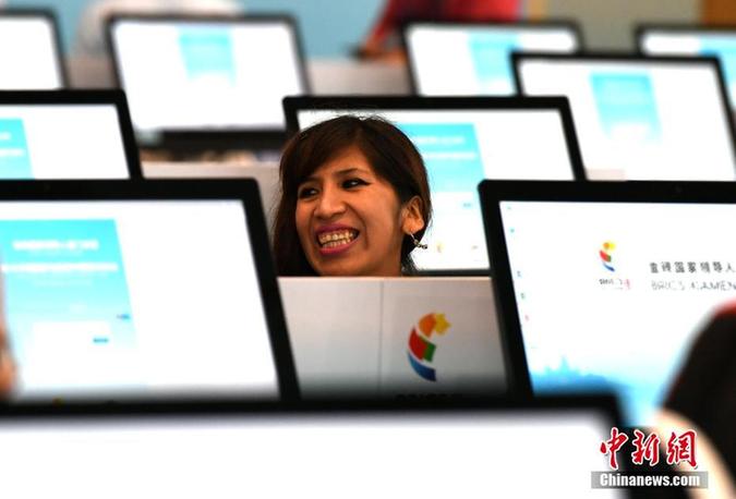 9月3日,外国记者在新闻中心开心交流。据悉,共有80个国家和地区的3000名中外记者报名采访本次金砖国家领导人厦门会晤。中新社记者 王东明 摄