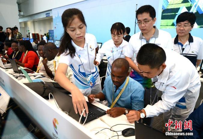 9月3日,新闻中心工作人员为外国记者调试网络。据悉,共有80个国家和地区的3000名中外记者报名采访本次金砖国家领导人厦门会晤。中新社记者 王东明 摄