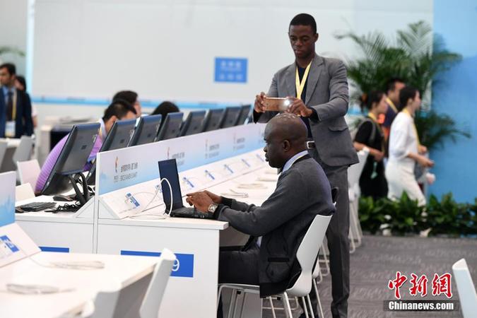 9月3日,外国记者在新闻中心交流。据悉,共有80个国家和地区的3000名中外记者报名采访本次金砖国家领导人厦门会晤。中新社记者 王东明 摄