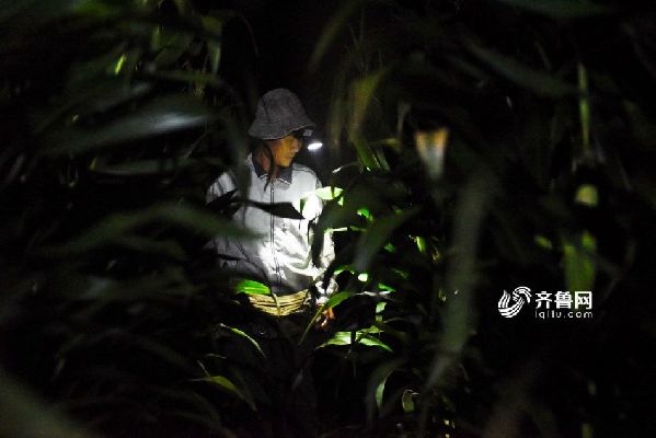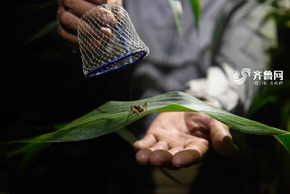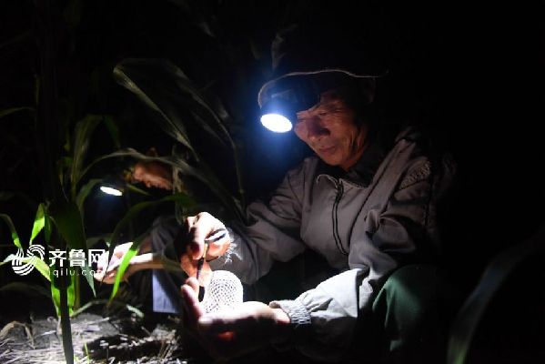 胡玉海捉蟋蟀一般在凌晨两点下地,这时候的蟋蟀会跑出来找食物喝露水。夜晚的玉米地里,成千上万只蟋蟀像是在聚会,到处都是叫声。胡玉海告诉记者,蟋蟀不是每只都捉,大部分都很普通,必须要挑选好品种、个头大的,所以捉蟋蟀最考验的是听力和眼力。“有些蟋蟀不停的叫,这种蟋蟀一定很普通,好的蟋蟀一晚可能就只叫两声,叫法特别、声音洪亮,离着500米远都能听到,这才是上等的蟋蟀”,胡玉海说。齐鲁网记者尹承谦 摄