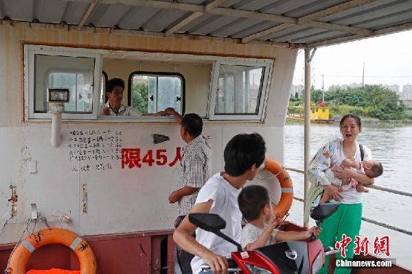 9月3日,上海民众在青浦区白鹤镇的万狮渡口乘坐轮渡往返,这个是现在苏州河上仅存的轮渡。随着城市建设的不断推进,不久这个轮渡也将停航。中新社记者殷立勤 摄