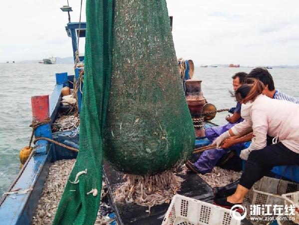 9月3日,舟山市普陀区渔老大黄红在沈家门附近海域进行张网作业,喜获虾潺丰收。