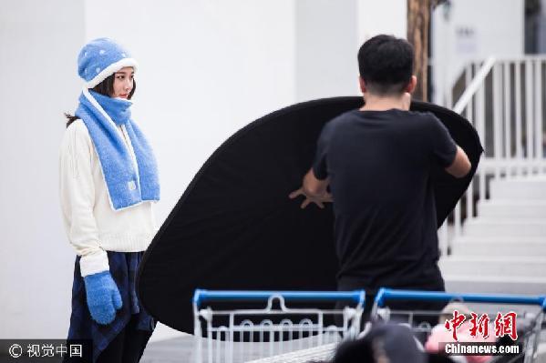 近日,浙江省杭州市一摄影基地里,一位女模特穿着毛衣、戴着围巾和手套拍摄照片。当天,杭州气温接近35℃,烈日下温度更高,拍一会功夫助理就要帮模特擦汗,但在镜头前为了拍摄效果仍需要假装很冷的样子。当天在摄影基地里,拍摄各个季节服装的模特都有,大家都蛮拼的。模特们直言,不管冷热,只要订单来了,春夏秋冬装都要拍。图片来源:视觉中国