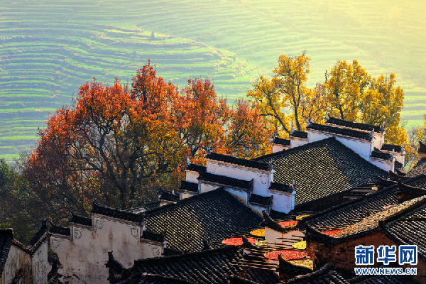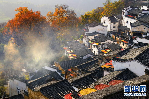 初秋时节,薄雾袅袅,晒秋和红枫点缀在徽派民居之中,独具东方美韵。