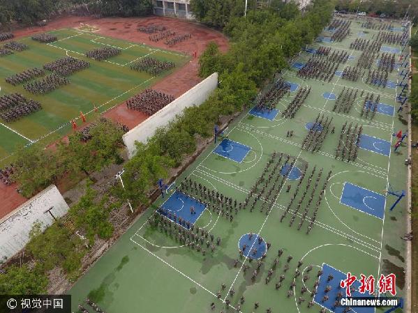 军训首日,学生们学习并练习了立正、稍息、跨立、停止间转法等科目,很好地完成了当日训练要求。 图片来源:视觉中国