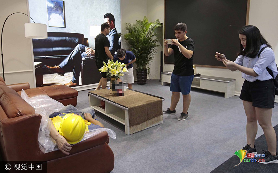 上海:工人熬夜布展困躺沙发 围观群众误认是行为艺术