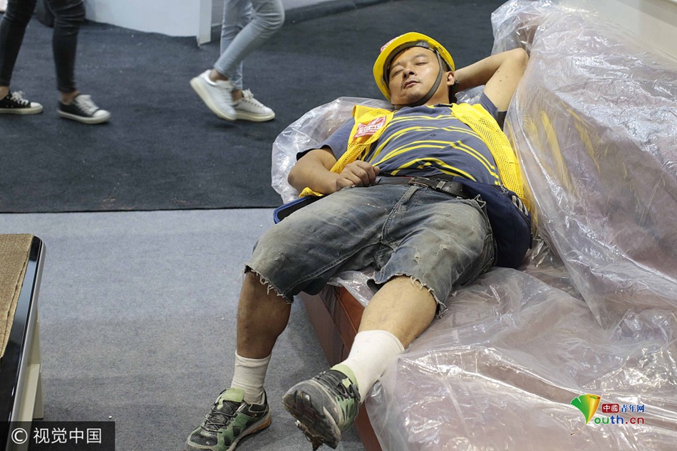 据了解,这名工人姓张来自安徽,前一天因为工期紧张,加班至凌晨4点左右,因为疲倦想靠在沙发上休息一会,未料竟睡过了头。在躺下之前他将一张塑料薄膜铺在了沙发上,生怕弄脏了展品。