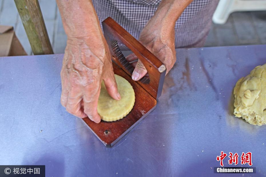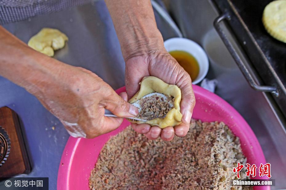 馅料是花生米、葵花籽、葡萄干、核桃仁、五谷杂粮,用纯手工压模、点红、烘烤,再加上传统纸卷筒包装。纪最长的是马新韩,65岁。他从12岁开始学习打月饼,以此维持一家人的生计。他们做的月饼,最大的特点就是“土”。图片来源:视觉中国