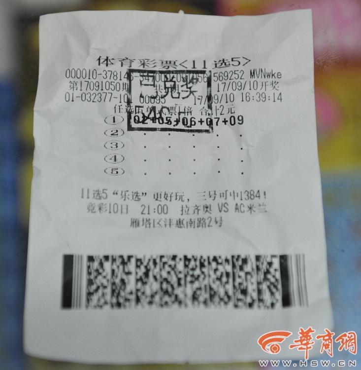 “希望失主能尽快领奖,奖金我已经领下来了!”9月11日晚7时许,西安高新区沣惠南路一体育彩票店老板王先生给华商报打来热线称,有彩迷在其彩票店购买彩票中奖但彩票丢失,他在清扫垃圾筐时发现中奖彩票,希望失主能去兑奖。图为西安市沣惠南路一彩票店,中奖的540元彩票。