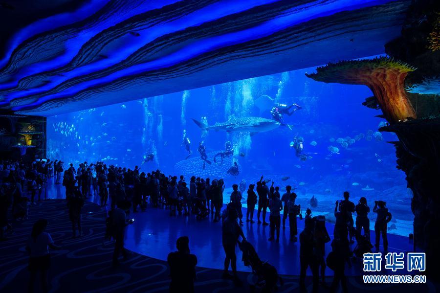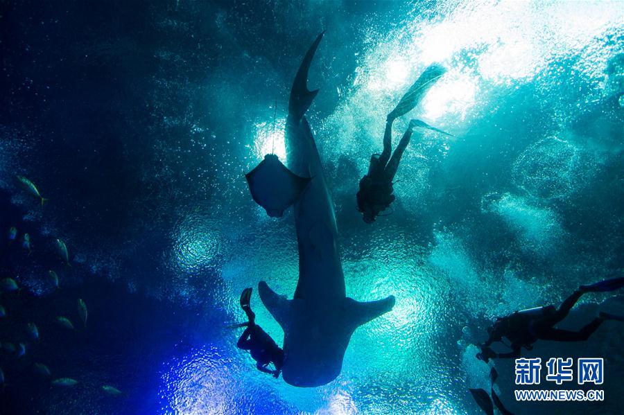 9月12日,潜水爱好者在珠海长隆海洋王国鲸鲨馆与鲸鲨同游。当日,10余位潜水爱好者在广东珠海长隆海洋王国鲸鲨馆成为首批体验“与鲸鲨同游”潜水项目的幸运儿。珠海长隆海洋王国鲸鲨馆潜水深度达到8米,参与该项目的游客在潜水教练一对一陪护下进行体验。为确保鲸鲨馆水下生态环境平衡,该项目每天开放20个体验名额。新华社记者刘大伟 摄