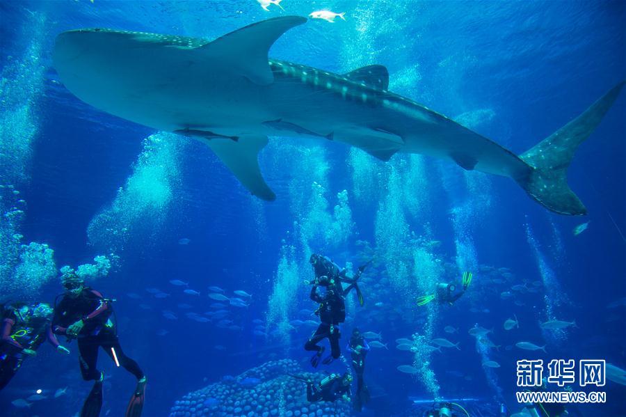 9月12日,潜水爱好者在珠海长隆海洋王国鲸鲨馆与鲸鲨同游。当日,10余位潜水爱好者在广东珠海长隆海洋王国鲸鲨馆成为首批体验“与鲸鲨同游”潜水项目的幸运儿。珠海长隆海洋王国鲸鲨馆潜水深度达到8米,参与该项目的游客在潜水教练一对一陪护下进行体验。为确保鲸鲨馆水下生态环境平衡,该项目每天开放20个体验名额。新华社记者刘大伟 摄
