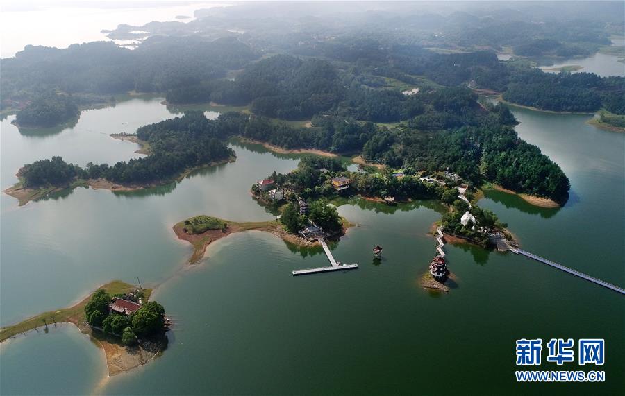 9月12日航拍的万佛湖万佛岛。万佛湖位于安徽省六安市舒城县境内,湖面50平方公里,容水9亿立方米,是国家地质公园和中国首批“国家水利风景区”。2016年,万佛湖成为国家5A级旅游景区,它以岛湖风景为载体,形成以湖泊景观、火山景观、文化景观为一体的岛湖文化旅游区,每年吸引大量游客前来观赏度假。新华社记者陶明 摄