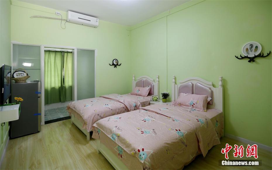 武汉生物工程学院的“清新田园风”二人间宿舍。该宿舍位于翠微居南楼,均为女生宿舍,共216间,装饰色调分为浅粉色和草绿色两种。每间宿舍面积约24平方米,均配有独立卫生间和内置阳台。室内除配备书桌、书架、衣柜、床等基本家具外,还配有沙发、茶几、空调、电视机、电冰箱、电话等生活设施。在该宿舍楼的公共区域还设有洗衣间和开水间,以及公共活动室、自习室、党员工作站、文化之家、瑜伽房、台球室等文体活动场所。该宿舍住宿费为每人每年2600元。卿萧 摄