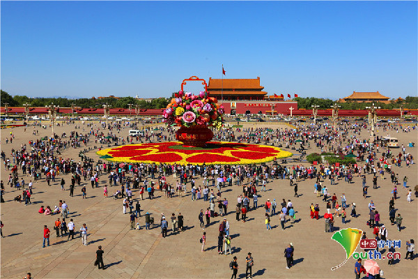 全国各地的游客来到天安门广场前与大花篮合照留念。中国青年网通讯员 李超 摄