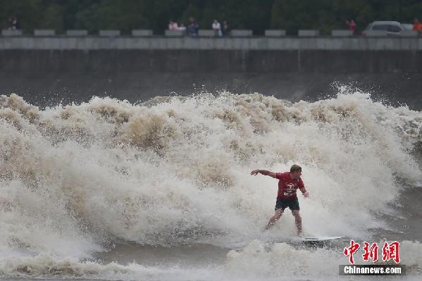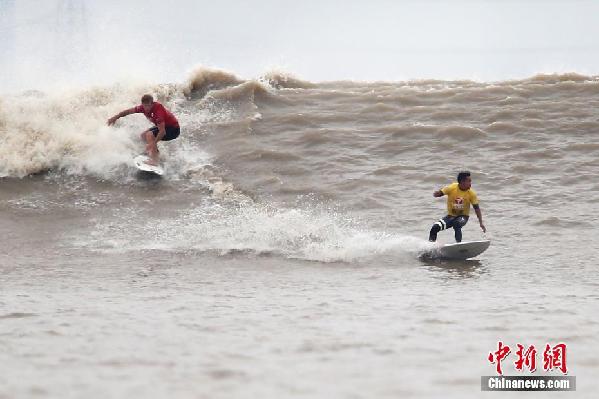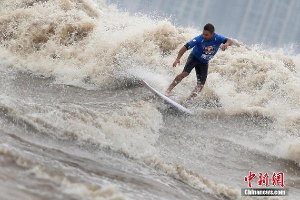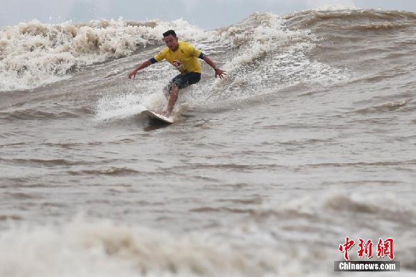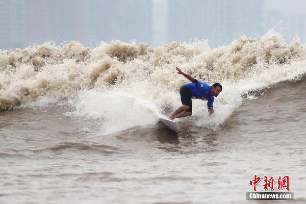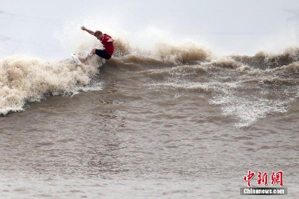 10月5日,来自中国、美国、澳大利亚、巴西和西班牙五个国家共计12位冲浪高手齐聚在杭州举行的2017卡拉宝钱塘江冲浪赛,在潮头浪尖上展开对决。图为参加首日比赛的中国队队员在比赛中。中新社记者 泱波 摄