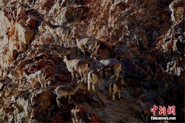 10月上旬,野狼、赤麻鸭、秃鹫、蓝马鸡、旱獭等各类野生动物出没在祁连山下,觅食、嬉戏、翱翔,勾勒出一幅动物和谐共融的美丽画卷。图为国家二级重点保护野生动物岩羊成群觅食。郎文瑞 摄