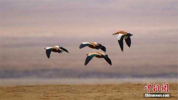 10月上旬,野狼、赤麻鸭、秃鹫、蓝马鸡、旱獭等各类野生动物出没在祁连山下,觅食、嬉戏、翱翔,勾勒出一幅动物和谐共融的美丽画卷。图为10月初,赤麻鸭飞临祁连山下。郎文瑞 摄