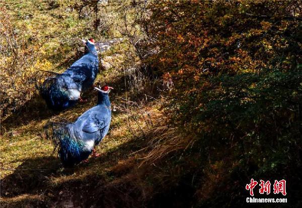 10月上旬,野狼、赤麻鸭、秃鹫、蓝马鸡、旱獭等各类野生动物出没在祁连山下,觅食、嬉戏、翱翔,勾勒出一幅动物和谐共融的美丽画卷。图为两只蓝马鸡在祁连山下漫步。郎文瑞 摄