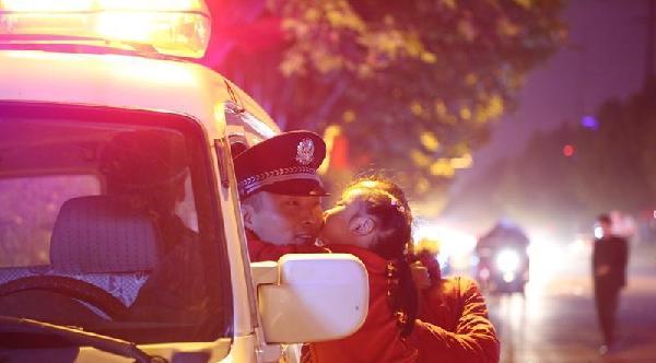 高平市公安局南城派出所民警刘文江正在夜间的大街上执勤,想念父亲的小女儿前来探望。匆匆一面后,女儿亲了刘文江一下,然后才恋恋不舍离开。王冠楠 摄