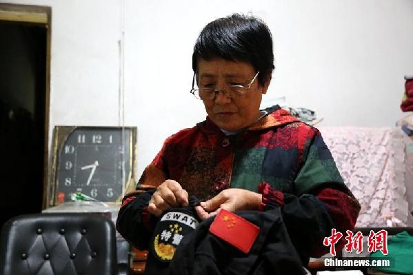 高平市公安局特巡警大队教导员宋建峰的母亲。天气逐渐变凉了,老母亲把厚警服拿了出来紧着扣子,等着儿子回家来取。 王冠楠摄