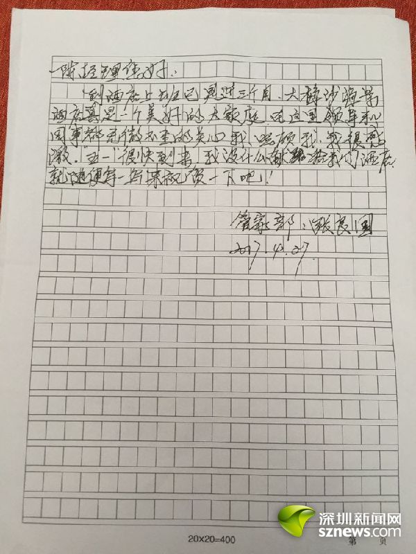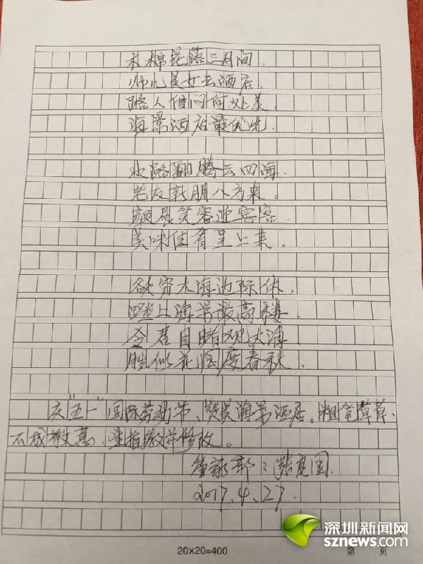 深圳新闻网讯 5月11日,区人资源局扶贫办与梅沙街道劳保办(经服办)一同深入企业走访广西贫困劳动力赴梅沙务工人员,详细了解帮扶对象的工作情况,包括企业签订合同、缴交社保、工资待遇、适应情况等,为广西省来梅沙务工的贫困劳动力送去了来自街道办的问候。就业人员对政府的关心和企业的接收表示了感谢。来自广西省乐业县甘田镇板洪村54岁张良国被安排在海景酒店工作,为了表示对工作和满意和对工作单位的感谢,特意作诗一首。接下来,梅沙街道将进一步做好来梅沙务工贫困劳动力的跟踪服务工作。