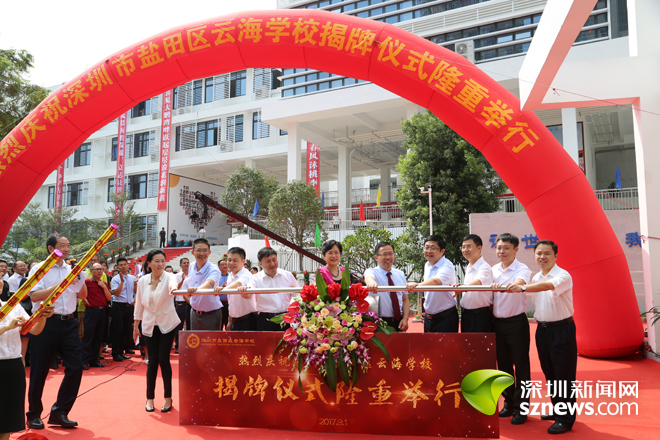 深圳新闻网讯 (记者 潘峰 邓雪婷)9月1日上午,盐田区首所九年一贯制学校——云海学校揭牌。记者了解到,学校设有36个班,可提供学位1680个。区委书记杜玲,区委副书记、区长吴德林,区领导武威、雷卫华、姚刚、王琨、常淑安、乔宏彬等出席了揭牌仪式。