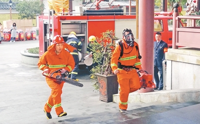 盐田区梅沙街道和盐田区民族宗教事务局联合在深圳东部华侨城大华兴寺举行消防应急演练。