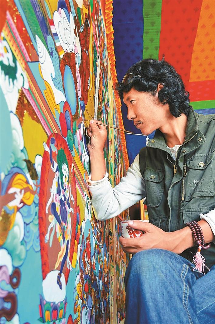 据他介绍,唐卡是藏族文化中一种独具特色的绘画艺术形式,题材内容涉及藏族的历史、政治、文化和社会生活等诸多领域,因此被誉为中国民族绘画艺术的珍品,被称为藏族的“百科全书”。而制作一幅唐卡,即使是最简单的作品也得需要一两个月,有的甚至需要花上几年时间。制作唐卡的颜料,传统上是全部采用金、银、珍珠、玛瑙、珊瑚、松石、孔雀石、朱砂等珍贵的矿物宝石和藏红花、大黄、蓝靛等植物为颜料,以示其神圣。天然原料保证了所绘制的唐卡色泽鲜艳,璀璨夺目,虽经几百年的岁月,仍是色泽艳丽明亮。