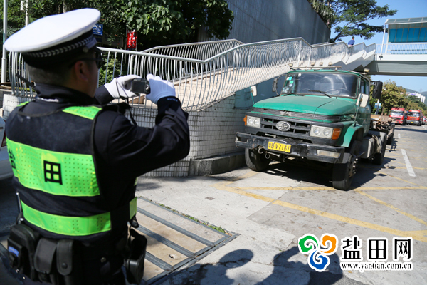 在随行过程中,记者发现,整个永安路畅通无阻,明珠道道路交通秩序也相对良好,两侧车辆有序停放。上午9时52分,在明珠社区居委会大楼前的明珠道上,吴琼生再次发现有绿色拖车停放在黄方格内,现场停车取证并依法开具罚单。