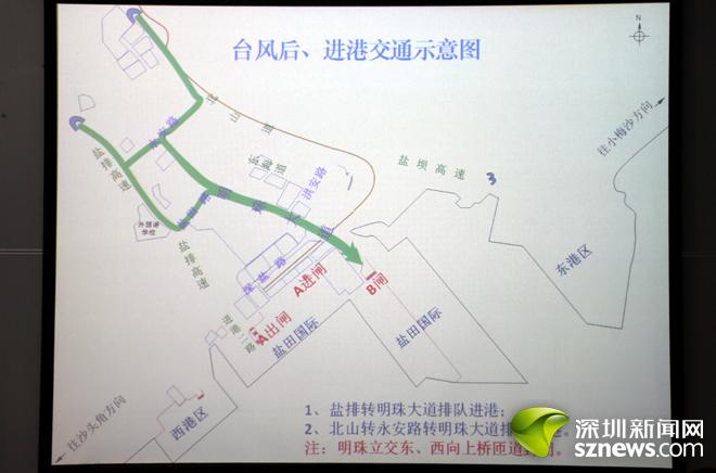 盐田国际相关负责人表示,如遇台风等恶劣天气,将根据需要开放A、B闸相关通道,同时安排人员做好港区内管理,防止因拥堵影响流转。此外,在对明珠道深盐路明珠立交进入B闸的货柜车实行交通管制的同时,还将视深盐路交通流量情况适时开放交通管制,允许部分货柜车从深盐路进入盐田港码头B闸,协助交警做好交通秩序管理。