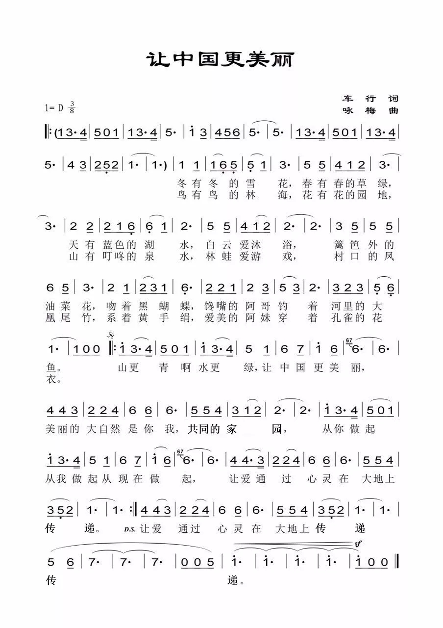 主题歌曲《让中国更美丽》邀请到著名音乐家车行、咏梅创作,描绘了冬有雪花、春有草绿、鸟有林海、山有泉水的诗意景色,呼吁大家从自身做起,从身边小事做起,通过自己的奋斗,留住鸟语花香、田园风光的美丽中国。