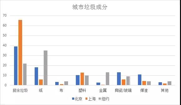从另一方面来看,限制我国垃圾焚烧技术的推行和发展的主要因素还需从源头说起。由于我国数千年来的生活习惯与西方有天壤之别,甚至我国内部不同地区的不同城市生活方式都有不同。这导致了我国的城市生活垃圾的成分上与其他国家、地区会存在决定性的差异。比如下图总结了北京、上海及纽约市的城市垃圾中所含有几类废物的含量。