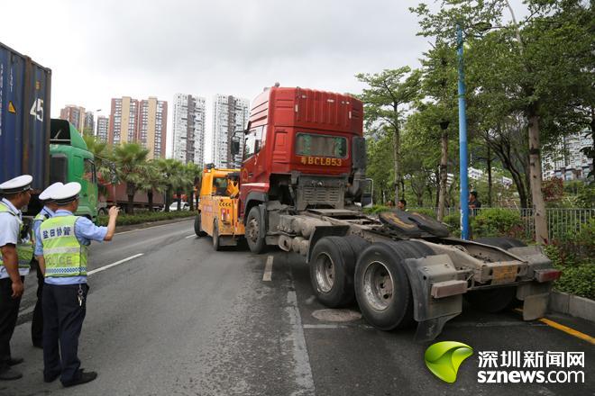 由于后方陆域货柜车停车位供需矛盾突出,货柜车临时停放在部分路段最外侧画框的车道,在不影响交通通行的前提下一般不受处罚。然而,有些物流企业和货柜车司机钻了空子,将常年废弃的僵尸拖头、拖车长期停放在路面上,非法挤占了公共资源,导致路面的“临时车位”长期处于饱和状态。