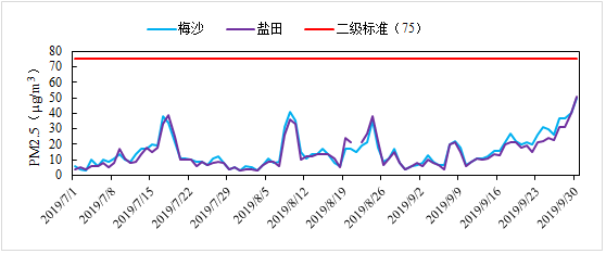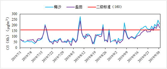 2019年第三季度,盐田区空气质量优良率下降的原因是有12天臭氧浓度超标,超标时段集中于9月下旬,其中梅沙子站有19天臭氧浓度超标,超标时段集中于9月18日至9月30日,盐田子站有12天臭氧浓度超标,超标时段集中于9月21日至9月30日。9月下旬盐田区主要气候特点为高温干燥少雨,高温、充足的日照会加剧大气发生光化学反应,有利于臭氧的生成。同时受干燥、无雨、弱风等不利天气的影响,空气对流较弱,大气水平和垂直扩散条件较差,进一步促进了O3的积累;而9月下旬主导风向为偏北风,可能受到区域传输的影响,导致盐田区臭氧浓度较高。