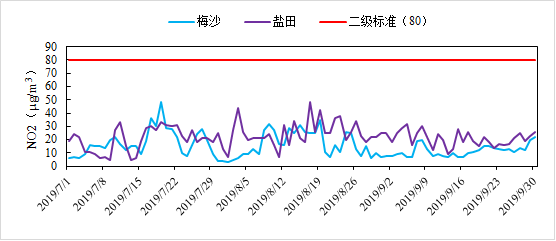 2019年第三季度,盐田区SO2、NO2、PM10、PM2.5、CO、O3平均浓度分别为5微克/立方米、19微克/立方米、27微克/立方米、15微克/立方米、0.6毫克/立方米和68微克/立方米。与2018年同期相比,2019年第三季度PM10、PM2.5、CO、O3平均浓度分别上升了2微克/立方米、1微克/立方米、0.1毫克/立方米、17微克/立方米,SO2和NO2平均浓度分别下降了2微克/立方米、7微克/立方米。
