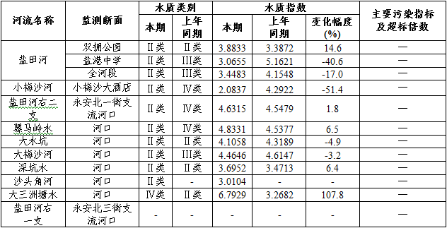盐田区纳入2019年监测的大小河流总共10条,监测断面为11个。2019年第三季度,盐田河、骡马岭水、大梅沙河、小梅沙河、深坑水、沙头角河、大水坑、盐田河右二支等8条河流水质达到地表水Ⅱ类标准,大三洲塘水水质达到地表水Ⅳ类标准,盐田河右一支第三季度未开展监测。与去年同期相比,小梅沙河、盐田河右二支、骡马岭水水质均由Ⅳ类变为Ⅱ类,水质明显好转;盐田河、大梅沙河水质均由Ⅲ类变为Ⅱ类,水质有所好转;深坑水、大水坑水质保持为Ⅱ类;大三洲塘水水质由Ⅱ类变为Ⅳ类,水质明显恶化;沙头角河无去年同期值无法进行同比。从水质指数来看,各河流中水质指数最高的为大三洲塘水,水质指数达6.8。大梅沙河、小梅沙河、盐田河、大水坑水质指数有所减小,减小幅度分别为3.2%、51.4%、17.0%、4.9%;盐田河右二支、大三洲塘水、深坑水、骡马岭水水质指数有所增大,增大幅度分别为1.8%、107.8%、6.4%、6.5%;沙头角河无去年同期值无法进行同比。