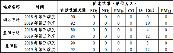 表3 2019年第三季度盐田区空气污染物超标天数与上年同期对比