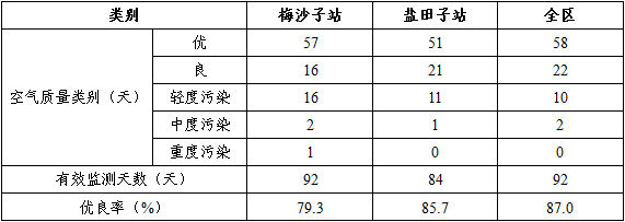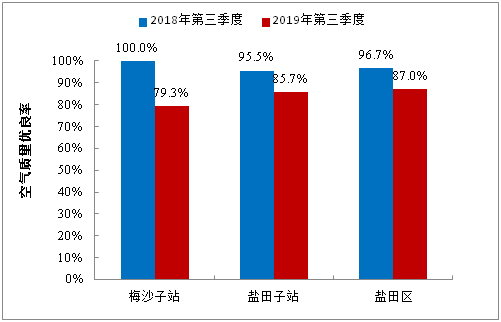 2019年第三季度,盐田区环境空气有效监测天数为92天,环境空气质量指数(AQI)范围为19~193,达到Ⅰ级(优)的天数为58天,达到Ⅱ级(良)的天数为22天,Ⅲ级(轻度污染)的天数为10天,Ⅳ级(中度污染)的天数为2天,空气质量优良率为87.0%。与2018年第三季度相比,空气质量优良率下降了9.7个百分点。