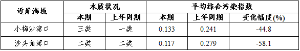 盐田区近岸海域共布设小梅沙湾口和沙头角湾口2个测点,监测结果显示小梅沙湾口和沙头角湾口分别达到《海水水质标准》(GB3097-1997)三类标准和二类标准,小梅沙湾口属于二类功能区,未达到功能区要求。