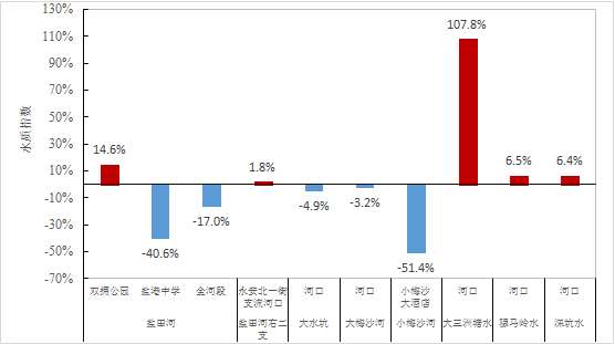 盐田区仅盐田河存在多个断面,盐田河包括双拥公园和盐港中学两个断面,两个断面水质均达到地表水Ⅱ类标准,与去年同期相比,双拥公园断面水质保持为Ⅱ类,盐港中学断面由Ⅲ类变为Ⅱ类。从水质指数来看,盐港中学断面水质指数有所减小,减小幅度为40.6%;双拥公园断面水质指数有所增大,增大幅度为14.6%。